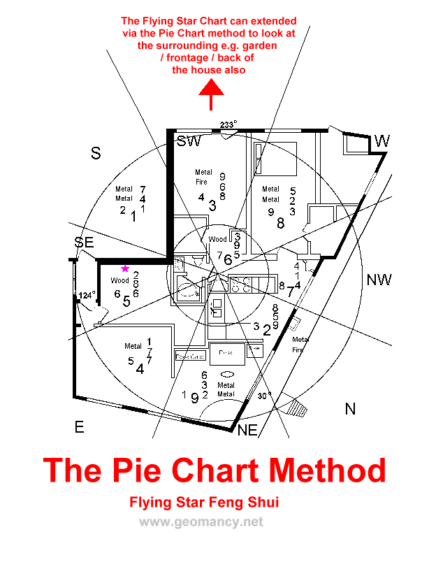 In fact, all the lines of this pie can be extended over to the entire boundary of the house for evaluation using Flying Star Feng Shui.